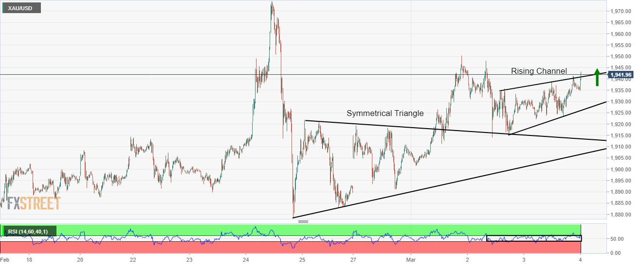 在15分钟范围内,金价在突破对称三角形后出现强劲上行走势。后来进入盘整,呈现上升通道的形成。目前,贵金属已突破上行通道,不排除进一步上涨。相对强弱指数(RSI)(14)在40.00-60.00范围内震荡后已升至60.00以上,这表明新一轮反弹的触发因素。
