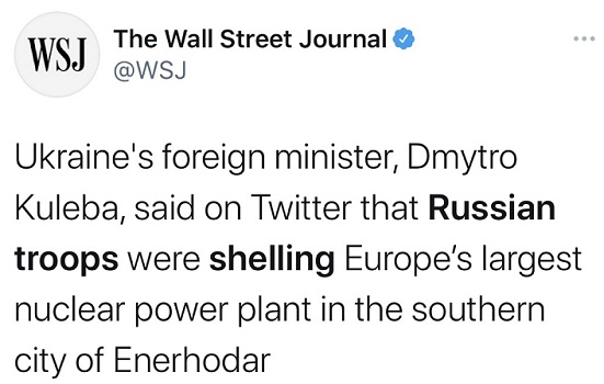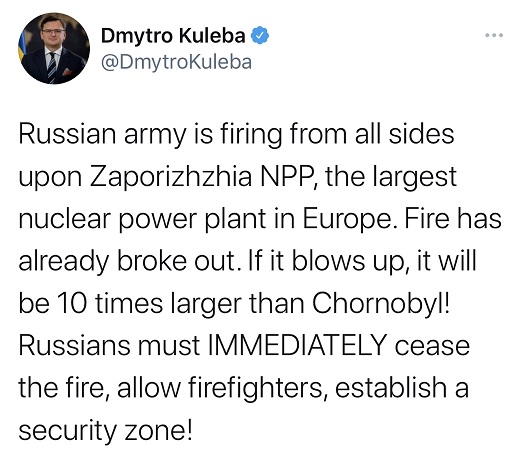 库列巴表示扎波罗热核电站一旦发生爆炸,造成的危害将是切尔诺贝利事故的10倍。库列巴要求俄军立即停火确保核电站的安全。