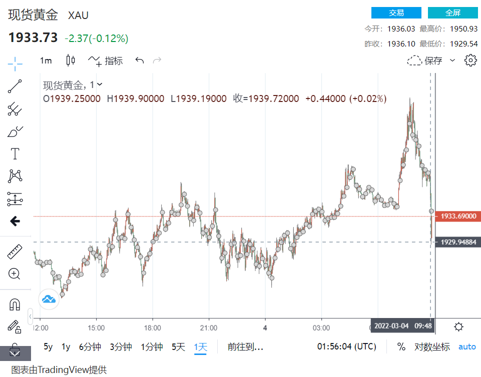 24K99讯 黄金价格4日坐上云霄飞车,跟随者俄乌最新战况而震荡。随着金价攀高冲破1950美元后,短线快速跌破1930美元,现稳于1933.73美元。避险情绪急剧下滑,相信与当前俄乌核电急报传来的快讯相关。