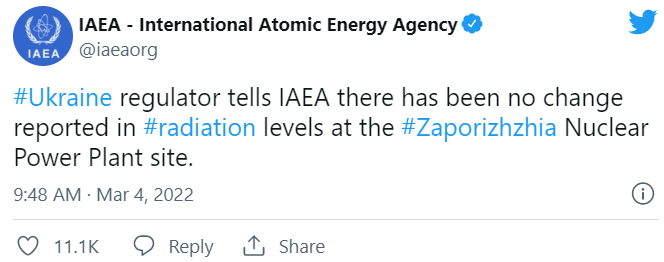在俄罗斯炮击导致札波罗热核电厂起火后不久,国际原子能机构(IAEA)表示,据回报,辐射水平目前没有变化。 该厂负责人则透过乌克兰的电视台表示,该设施辐射目前安全。