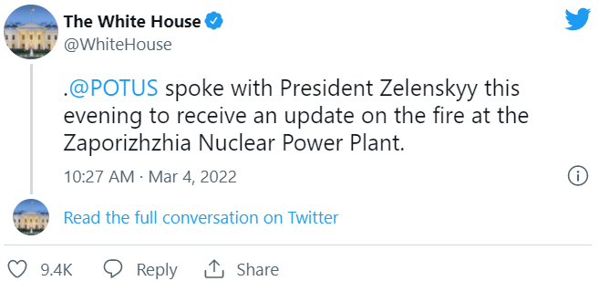 白宫紧急发布一系列推文表示,美国总统拜登与乌克兰总统泽连斯基就俄罗斯炮击札波罗热核电厂发生的火灾进行了交谈。白宫在推特写道,拜登 “与泽连斯基总统一起敦促俄罗斯停止在该地区的军事活动,并允许消防员和紧急救援人员进入该地。”