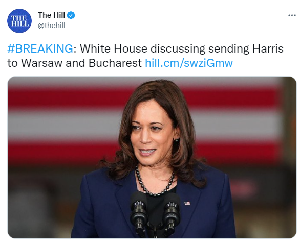 熟悉谈话的消息人士告诉国会山报(The Hill),白宫正在积极讨论在未来几天内将副总统哈里斯派往波兰华沙和罗马尼亚布加勒斯特,以表达对乌克兰的声援,因为它面临着俄罗斯不断升级的入侵。