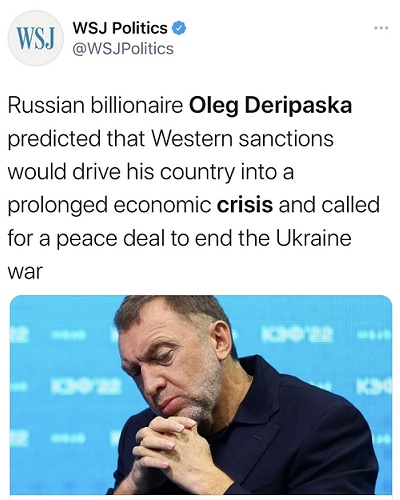 FX168财经报社(香港)讯 俄罗斯入侵乌克兰后,许多国家和企业纷纷对俄罗斯祭出制裁。俄罗斯亿万富翁德里帕斯卡(Oleg Deripaska)认为,西方制裁对俄罗斯施加的经济压力,比俄罗斯有史以来遇到的任何状况都要严重,将产生持久的影响。