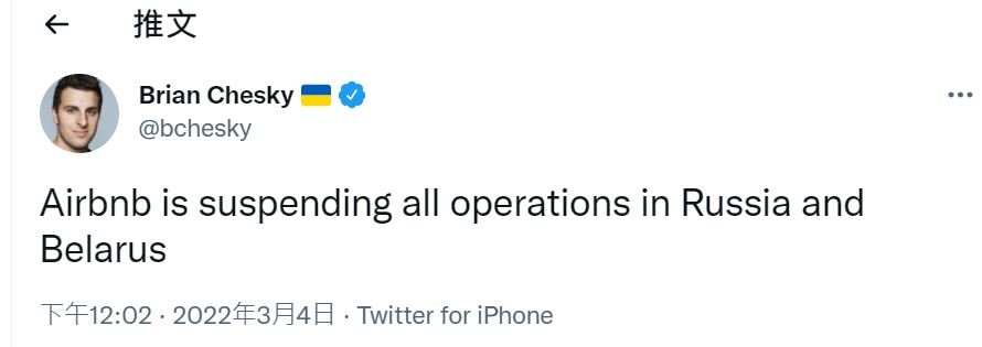 全球订房平台Airbnb创始人兼首席执行官切斯基(Brian Chesky)在推特表示,暂停在俄罗斯和白俄罗斯的所有业务。