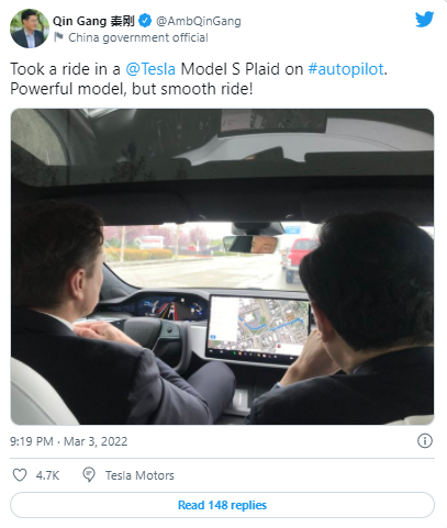 特斯拉驻中国的一名代表向彭博社证实,这次驾驶是在加州弗里蒙特进行的,但没有提供更多细节。秦刚在推特上分享了在车内拍摄的照片,还有一张他与马斯克会面时的照片,马斯克穿着黑色西装,打着领带。