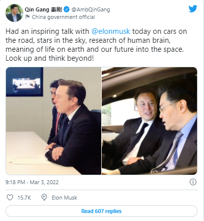秦刚在推特上表示,他和马斯克讨论了从汽车到“天空中的星星、人类大脑的研究、地球上生命的意义以及我们在太空的未来”的方方面面。