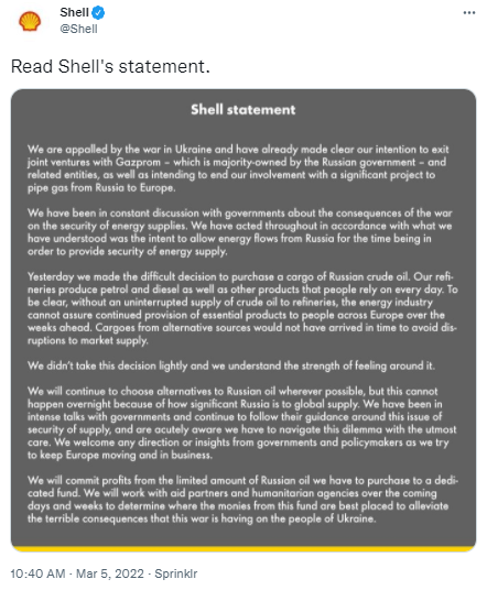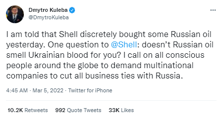“问壳牌一个问题:俄罗斯的石油难道闻不到乌克兰人的血味儿吗?”库列巴在推文中写道,“我呼吁全球所有有意识的人,要求跨国公司切断与俄罗斯的所有商业联系。”
