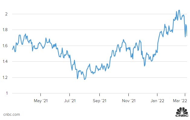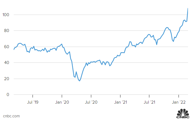 俄罗斯入侵乌克兰引发了更多的通胀担忧,由于油价上涨,经济学家已经提高了他们的通胀预期。由于俄罗斯是小麦、钯、铝和其他大宗商品的重要生产国,整个大宗商品市场已经走高。