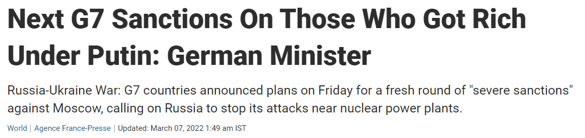 FX168财经报社(香港)讯 七国集团(G7)宣布下轮制裁对象,将锁定俄罗斯寡头,意味着美国制裁将获得更多跟进。而俄罗斯军队日前发出警告,要求各国不要收留乌克兰战机,否则将被视同参战。