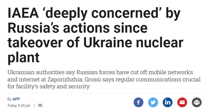 法新社报道提到,国际原子能总署通过声明表示,他们接获乌克兰的通知,称扎波罗热(Zaporizhzhia)核电厂高层正接受俄罗斯军队指挥官的命令。据乌方通报,俄军已关闭部分行动网路和固定网路,电话线路、电子邮件和传真也无法使用。