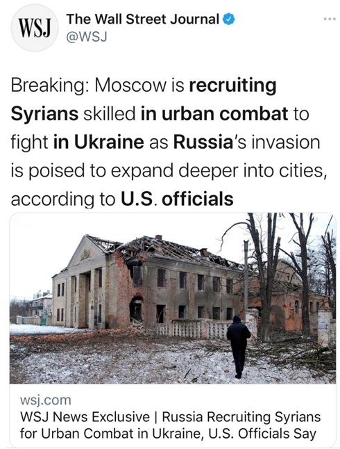 据《华尔街日报》周一(3月7日)最新报道,四名美国官员指出,美方的评估显示俄罗斯最近几天一直在叙利亚招募佣兵,俄方希望他们在城市战斗方面的专长能够帮助夺取基辅,对乌克兰政府造成毁灭性打击。