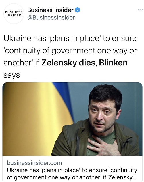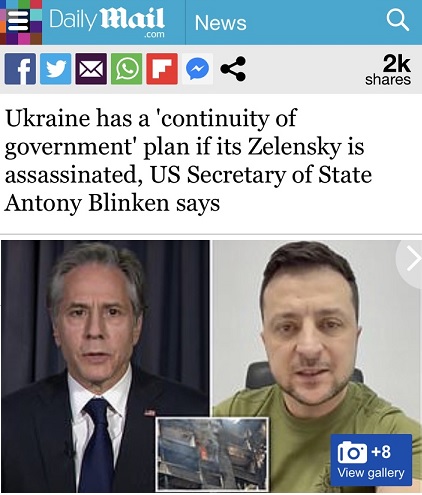 美媒称,乌克兰方面已制定了总统泽连斯基身亡的紧急预案。美国国务卿布林肯也表示,乌克兰有计划保持政府的连续性。