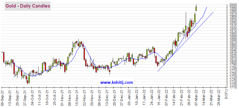 FX168财经报社(香港)讯 周一(3月7日)亚市盘中,黄金期货维持大涨态势,目前交投在1995美元/盎司附近,日内大涨近30美元;亚市早盘期金一度突破2000美元/盎司大关。Kshitij咨询服务团队(Kshitij Consultancy Service)周一最新撰文,对黄金期货、白银期货、原油期货和铜期货后市走势进行前瞻分析。