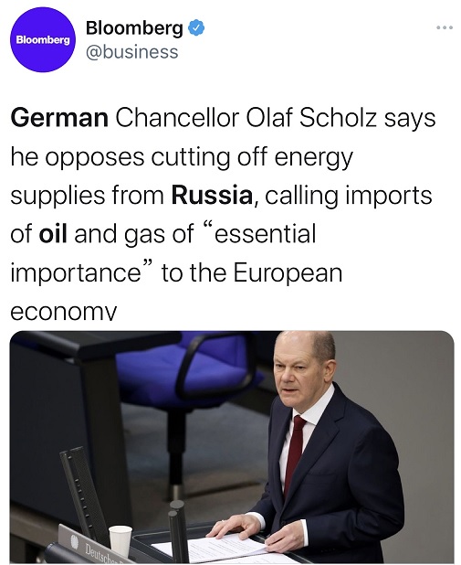 据彭博社、纽约时报等媒体报道,德国总理朔尔茨(Olaf Scholz)表示,他反对切断来自俄罗斯的能源供应,称进口石油和天然气对欧洲经济“至关重要”。
