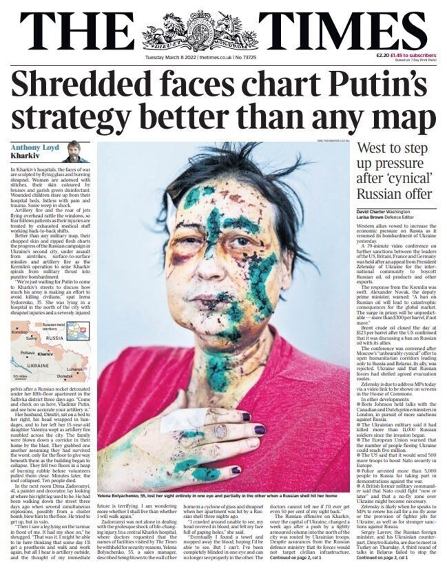 乌克兰入侵在8日报纸头版全面领先,头条新闻集中在普京提出的停止战争的要求清单、帮助更多难民的请求以及担心如果俄罗斯石油出口被禁止,英国的账单可能会增加等问题。
