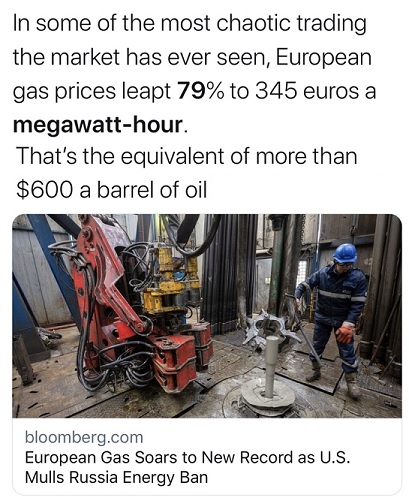 彭博报道称,在市场有史以来最混乱的交易中,欧洲基准天然气价格一度暴涨79%,至345欧元/兆瓦时(MWh),创历史新高,相当于原油价格每桶超过600美元。