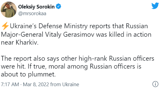 英国卫报(The Guardian)报道称,俄罗斯将军在战斗中丧生。据乌克兰国防部称,一名俄罗斯高级将领在哈尔科夫的战斗中丧生。该部在推特上表示,其部队杀死维塔利·格拉西莫夫少将(Maj Gen Vitaly Gerasimov)。据信,他是俄罗斯第41集团军第一副司令。