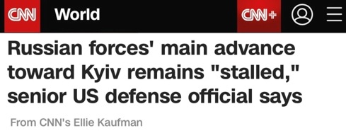 这名官员表示:“我们仍然相信他们在城外,主要的推进仍在城外停滞。我不知道他们目前离基辅有多远。他们确实在继续努力取得进展。”