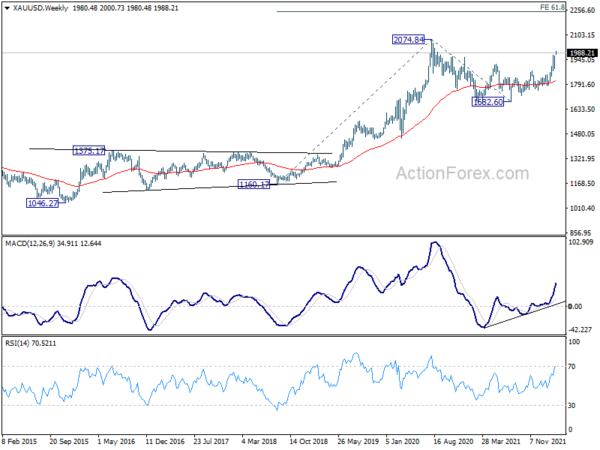 ActionForex.Com指出,金价本周跳空高开,并一度突破2000美元/盎司。金价突破阻力位1974.32美元/盎司,因此确认金价已经恢复始于1682.60美元/盎司的反弹走势。只要金价守住支撑位1923.09美元/盎司,那么预计金价将进一步反弹,并测试高点2074.84美元/盎司。