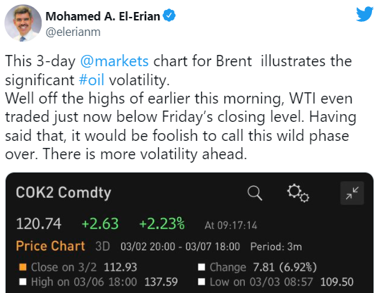 油价飙升至2008年以来的最高水平,尽管布伦特原油在周一短暂飙升至138美元后,周二早盘下跌0.7%至122.30美元,而历史最高价为147.50美元。