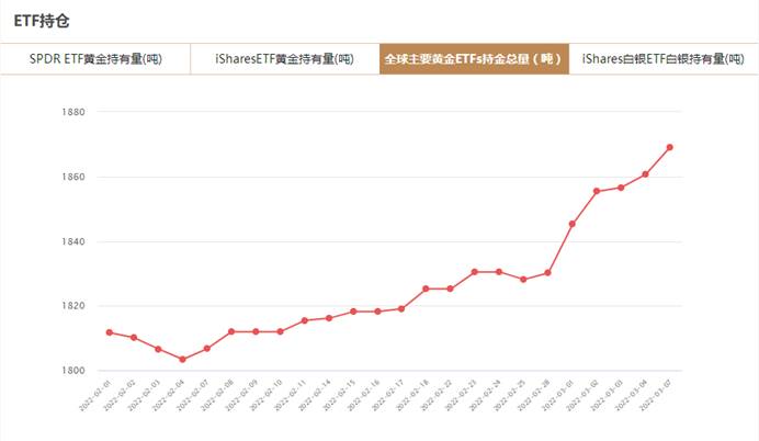 根据黄金信息网站www.24K99.com对全球8大主要黄金ETF的监控数据显示,截至2022年3月7日,全球8大黄金ETFs持仓总量为1869.117吨,与上一交易日增加8.42吨。