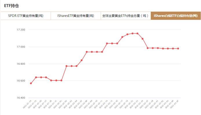 iShares白银ETF3月7日白银持有量为16977.97吨,与上一交易日持平。