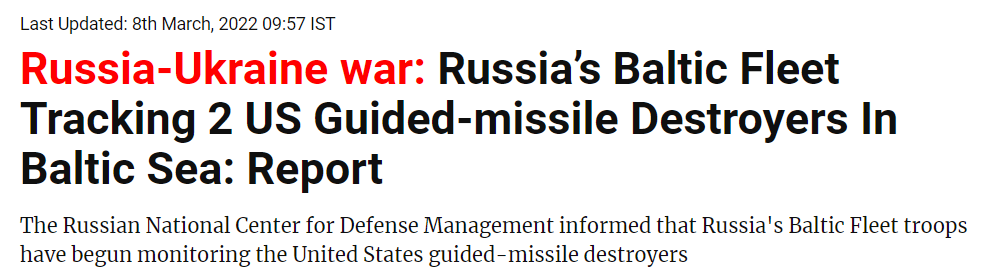 该消息称:“波罗的海舰队兵力兵器开始跟踪驶入波罗的海水域的美国海军‘唐纳德·库克’号和‘福雷斯特·谢尔曼’号导弹驱逐舰的行动。”