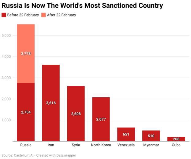 这导致俄罗斯遭受的制裁数量达到5530项,超过伊朗的3616项和叙利亚的2608项。伊朗遭制裁多数原因是核武计划和支持恐怖主义份子。
