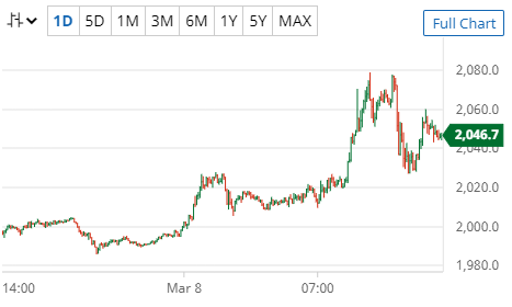相比之下,自东欧冲突爆发以来,金价上涨了8.7%。周二美市尾盘,COMEX 4月黄金期货一度触及2078.80美元/盎司,尾盘有所回落,收报2043.30美元/盎司,但仍逼近2020年8月6日所创收盘历史最高位2069.40美元/盎司。