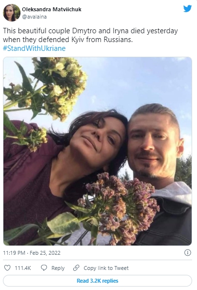 “我们要向这位女性的勇气致敬,她是一位诗人和文学教师,是5个孩子的母亲,她已经在顿巴斯战争中作为志愿者而声名鹊起。俄罗斯入侵后,她加入了抵抗运动,11天前,她和她的伴侣、孩子们的父亲一起去世了。”
