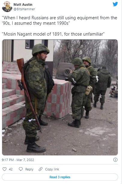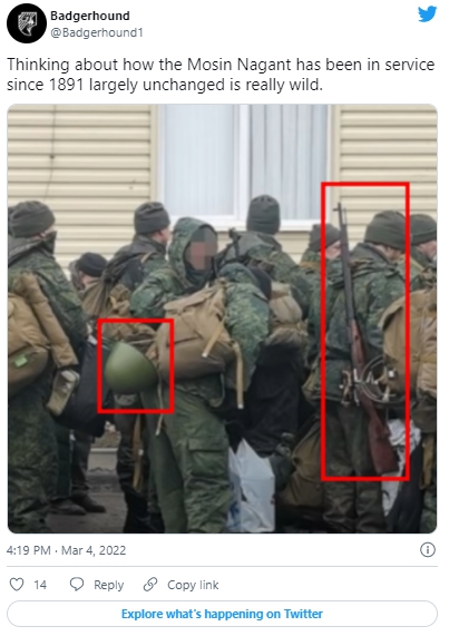 此外,乌克兰媒体称,俄军前线士兵收到的武器并不精良,从外媒拍到的照片可见,这些士兵使用的是19世纪的手动步枪“莫辛-纳干”,因此讽刺这些武器“根本像是历史电影道具”。