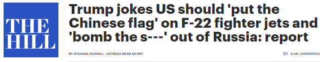 FX168财经报社(北美)讯 美国前总统特朗普新奥尔良对共和党捐款人发表演讲时开玩笑说,美国应该把中国国旗挂在F-22战机上,并对俄罗斯进行狂轰滥炸,以报复俄罗斯入侵乌克兰。