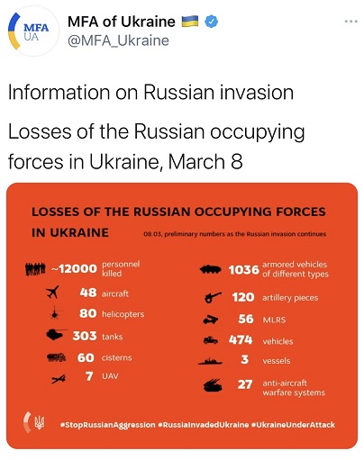 乌克兰国防部与外交部发布消息称,俄罗斯在2月24日至3月7日这12天的入侵行动中,共损失将近1万2千名士兵、303辆坦克、80架直升机、48架飞机、7架无人机、1036辆各式装甲车、120座火炮、3艘船舰等军备武器。