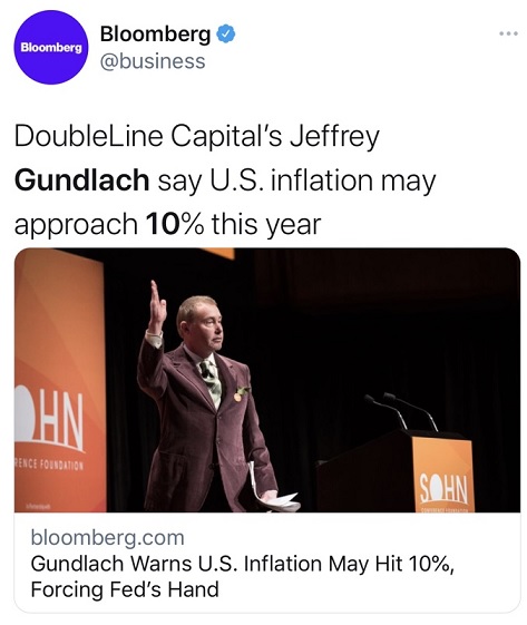 FX168财经报社(香港)讯 双线资本(DoubleLine Capital)联合创始人兼首席投资官、有“新债王”之称的冈拉克(Jeffrey Gundlach)表示,美国今年的通胀率可能会接近10%,这一历史水平凸显美联储需要积极收紧货币政策,即使在俄乌战争对局势造成新的不确定性背景下也要继续。