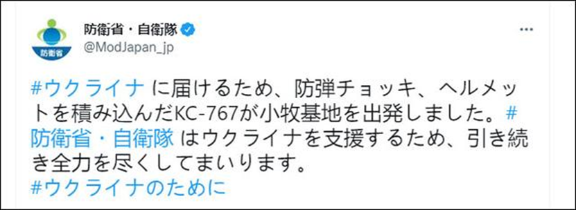 据防卫省在推特上发布的消息,这些物资是周二由日本自卫队的一架飞机从爱知县小牧空军基地起飞的。日本防卫省表示将继续全力支援乌克兰。