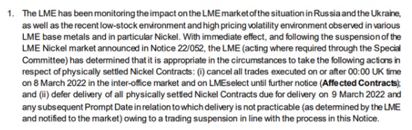伦敦金属交易所3月8日晚间发布公告称,取消所有当地时间3月8日凌晨0点或之后在场外交易和LME select屏幕交易系统执行的镍交易,并将推迟原定于2022年3月9日交割的所有现货镍合约交割。