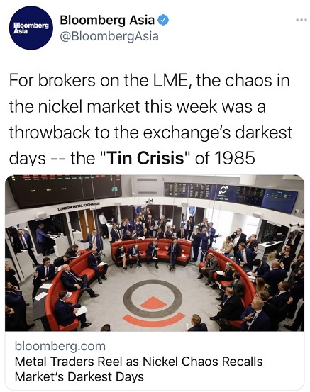 镍的疯狂走势唤起人们对LME最黑暗时期的回忆,即发生在1985年的“锡危机”(Tin Crisis)。