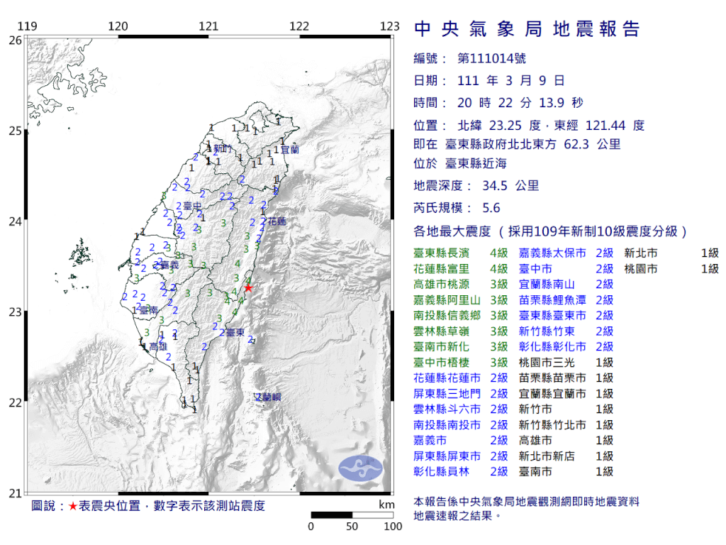 “气象局地震测报中心”表示,这个地震几乎全台都有2级以上震度,影响较大是台东北部、花莲南部,震度达4级;其他南投、嘉义、云林、台中、高雄一带约3级;双北约1级或是无感。