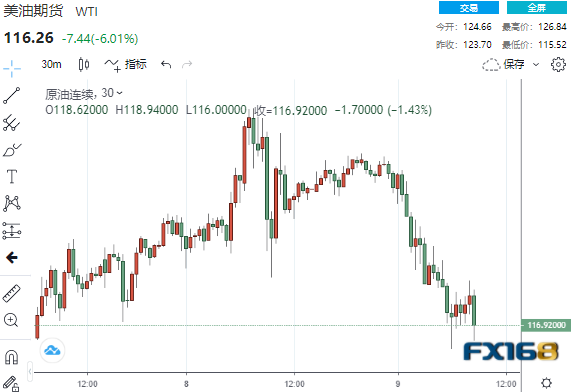 美国基准WTI中质原油下跌超7%,至115.12美元/桶低点,而国际标准布伦特原油下跌超8%,至118.72美元/桶。