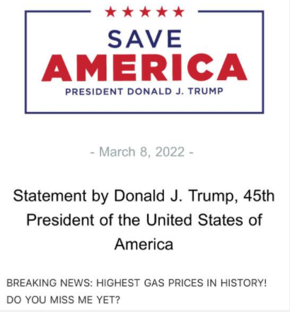 FX168财经报社(北美)讯 周二(3月8日),美国前总统特朗普发表了一份只有12个英文单词的声明:“突发新闻:有史以来最高的油价!你们想我了吗?”