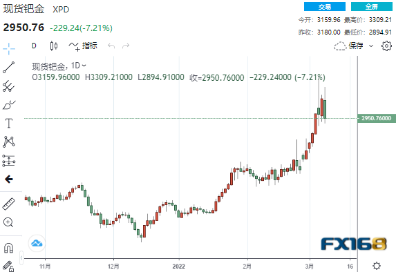 现货钯金尾盘收报2950.76美元,日内大跌229.24美元/盎司或7.21%,盘中最高触及3309.21美元/盎司,最低触及2894.91美元/盎司。周一钯金曾触及3440.76美元/盎司的历史高点,原因是市场担心主要生产国俄罗斯的供应中断。钯是汽车制造商用于减排的催化转换器。