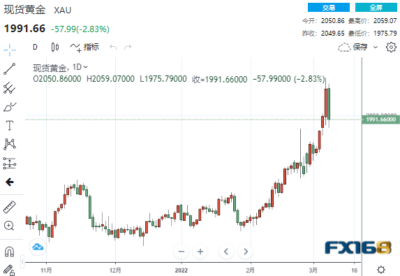 美市尾盘,现货黄金收报1991.66美元/盎司,大幅下跌57.99美元或2.83%,日内最高触及2059.07美元,最低触及1975.79美元。