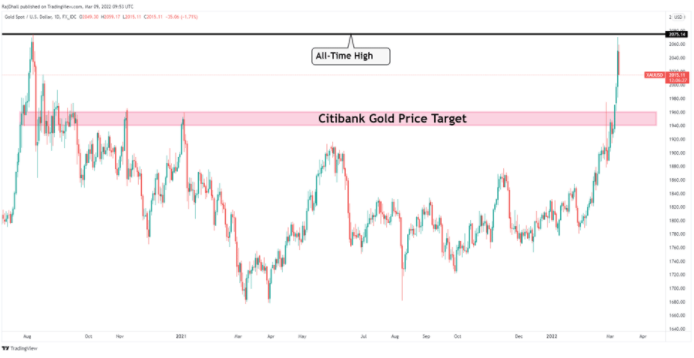 周三美市尾盘,现货黄金收报1991.66美元/盎司,大幅下跌57.99美元或2.83%,日内最高触及2059.07美元,最低触及1975.79美元。花旗的6至12个月目标价意味着其将较目前的水平水平下跌超240美元。