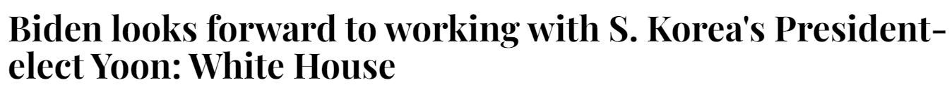 但周三美国祝贺尹锡悦,也称总统登期待与新韩国领导人合作。白宫发言人在电子邮件中告诉韩联社:“我们祝贺尹锡悦美国和韩国、我们的经济和我们的人民之间的联盟是铁定的。拜登总统期待着,继续与新总统选择进一步扩大我们的密切合作。”
