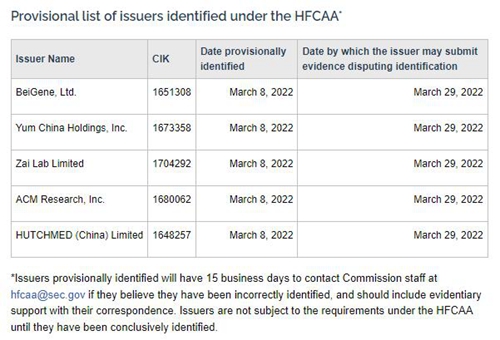 据悉,SEC于3月8日敲定了这份临时名单,包括百济神州、百胜中国、再鼎医药、盛美半导体、和黄医药。