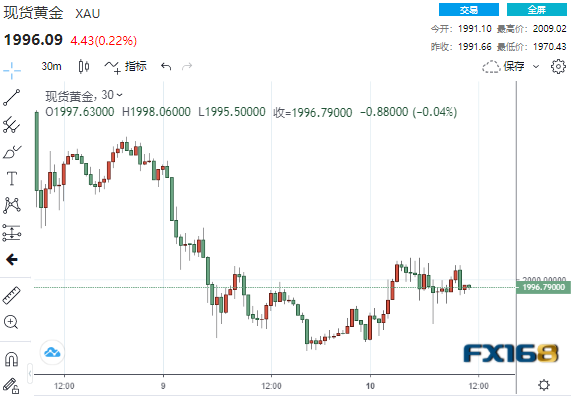 数据公布之后,现货黄金一度震荡下滑约17美元至1981.60美元/盎司,现回升至1996美元/盎司一线。