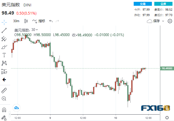美国公布通胀报告后,美元指数扩大涨势至超0.5%,日内最高触及98.52。