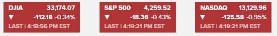 道琼斯指数在下跌112.18点或0.34%,收于33174.07点。标准普尔500指数下跌0.43%至4259.52点。受苹果和Meta拖累,以科技股为主的纳斯达克综合指数下跌0.95%至1312.96点。