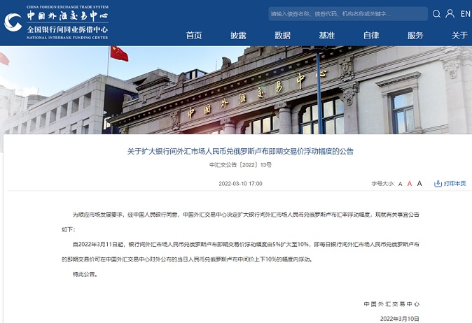 自2022年3月11日起,银行间外汇市场人民币兑俄罗斯卢布即期交易价浮动幅度由5%扩大至10%,即每日银行间外汇市场人民币兑俄罗斯卢布的即期交易价可在中国外汇交易中心对外公布的当日人民币兑俄罗斯卢布中间价上下10%的幅度内浮动。