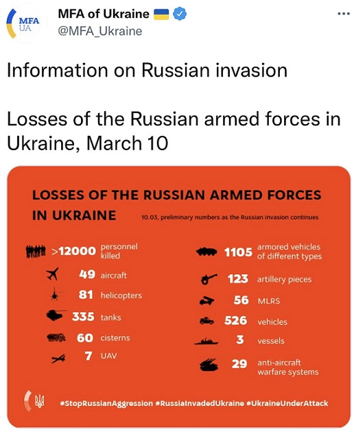 乌克兰军方与外交部3月10日发布消息称,俄罗斯在2月24日至3月10日这15天的入侵行动中,共损失超过1万2千名官兵、335辆坦克、49架军机、81架直升机、7架无人机、1105辆各式装甲车、123门火炮系统、56辆多管火箭车、526辆各式军车、60辆油罐车、29组防空系统以及3艘船舰。